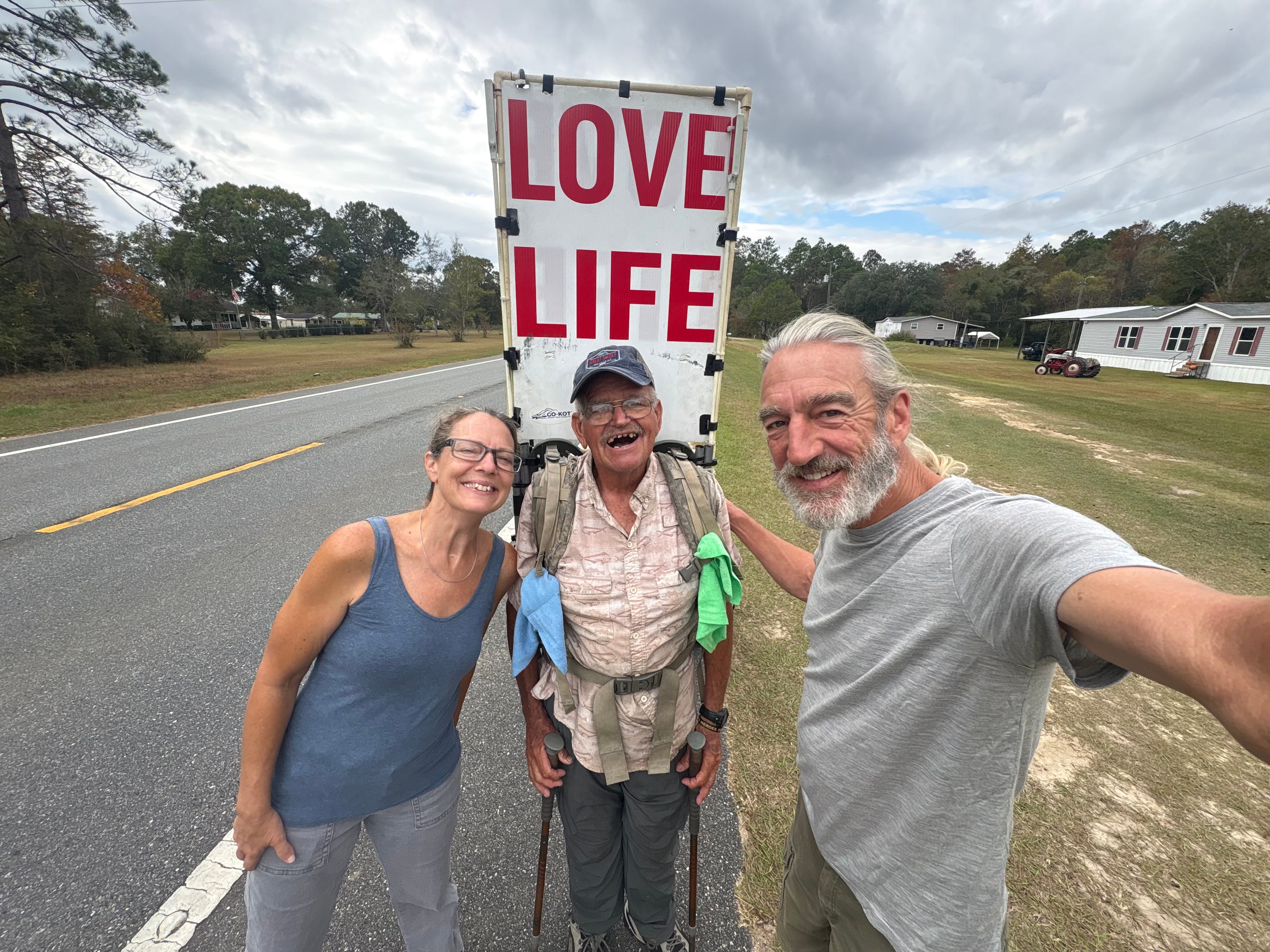 About a week ago, we saw him on the side of a country road in North Florida. We recognized him with his HUGE “Love Life” sign. We turned the car around, pulled up in front of him, got out and introduced ourselves, thanking him for his life-altering book. Steve has been hiking since 1999. While he was thru-hiking the Appalachian Trail that year, his son took his life. Steve was devastated, he ended up in the hospital himself. But with the help of friends and his family, he regained strength. He decided he wanted to do something to stop other people from taking their own lives. So he got a huge sign that said “Love Life” and started hiking with it.